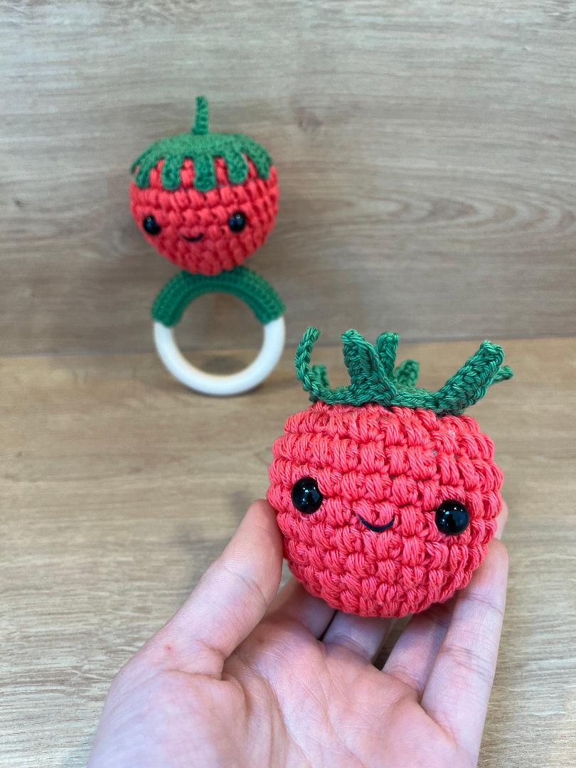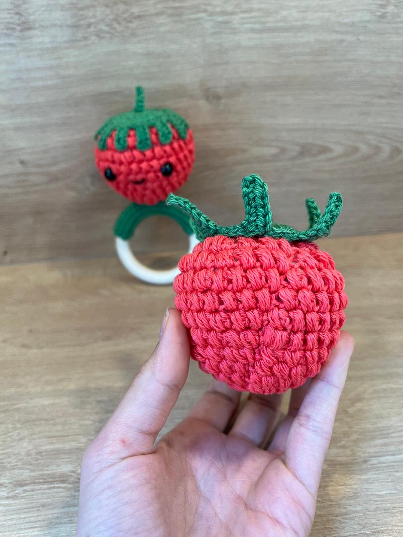 Mit dieser Häkelanleitung könnt ihr eine Himbeerrassel in verschiedenen Varianten häkeln.
